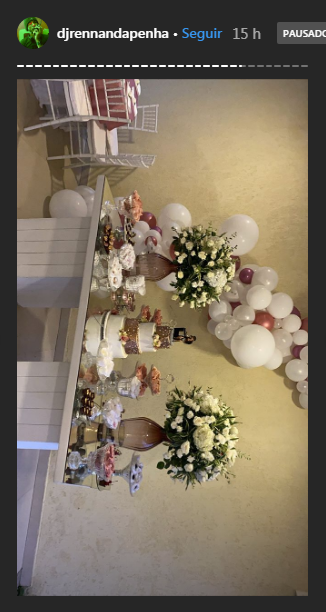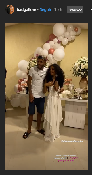 Lorenna usou um longo vestido branco, enquanto Rennan estava mais despojado, com bermuda, camisa branca e boné. A decoração contou com flores brancas e balões em tons claros. O bolo, aliás, combinou muito bem com o ambiente, decorado com alguns andares dourados e detalhes rosé. Além disso, Lorenna fez questão de mostrar a linda aliança que ganhou. O anel, todo cravejado com brilhantes, é da famosa grife Pandora. Aliás, uma aliança de ouro será confeccionada para ambos, por isso, por enquanto, só Lorenna usa um anel.