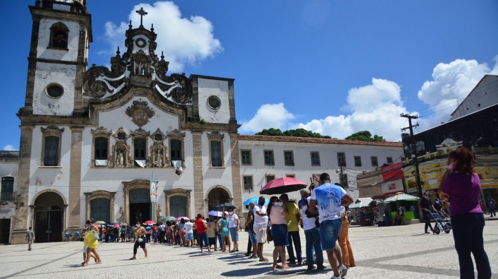 Muitos fiéis se aglomeraram, nesta terça-feira (14), no Pátio do Carmo para assistir a missa dedicada à padroeira do Recife. Sem ninguém para organizar a fila, uma grande aglomeração se formou, sem preocupações com o distanciamento social. Aliás, as primeiras pessoas da fila afirmaram chegar no Pátio do Carmo por volta das 9h da manhã.